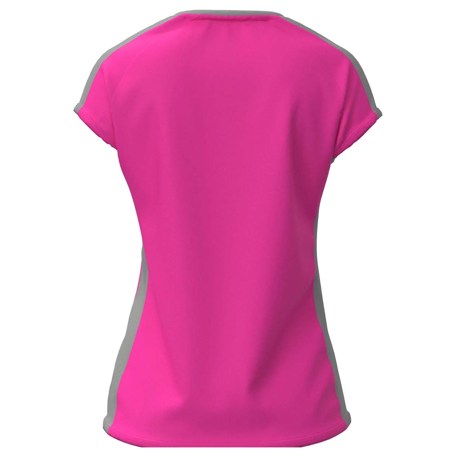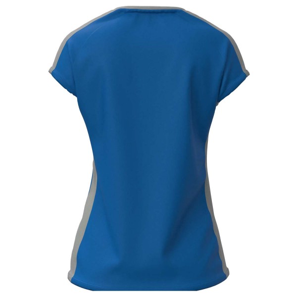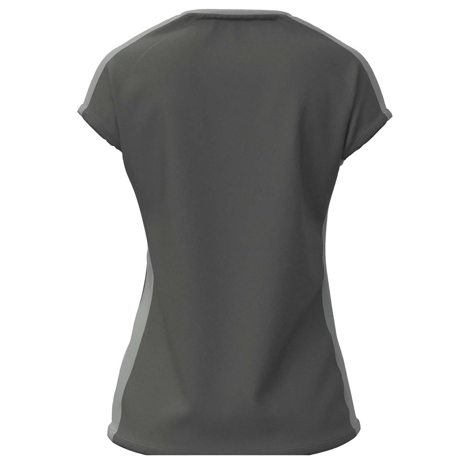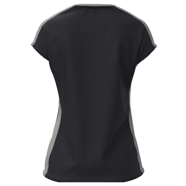 Tee shirt de sport pour femme avec une coupe cintrée à la taille. Son col à mi-chemin entre le col rond et le col V offre un design original, sublimé par la bande grise contrastante spécifique à ce modèle. Optez pour un look sobre mais unique.