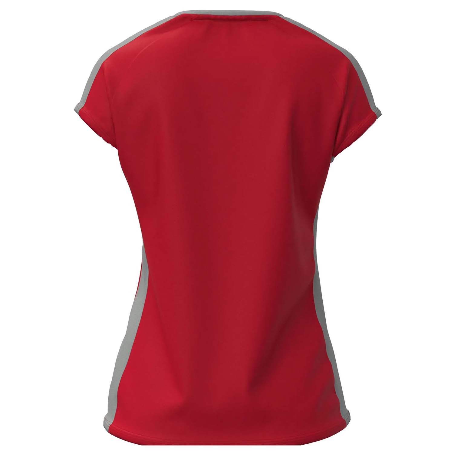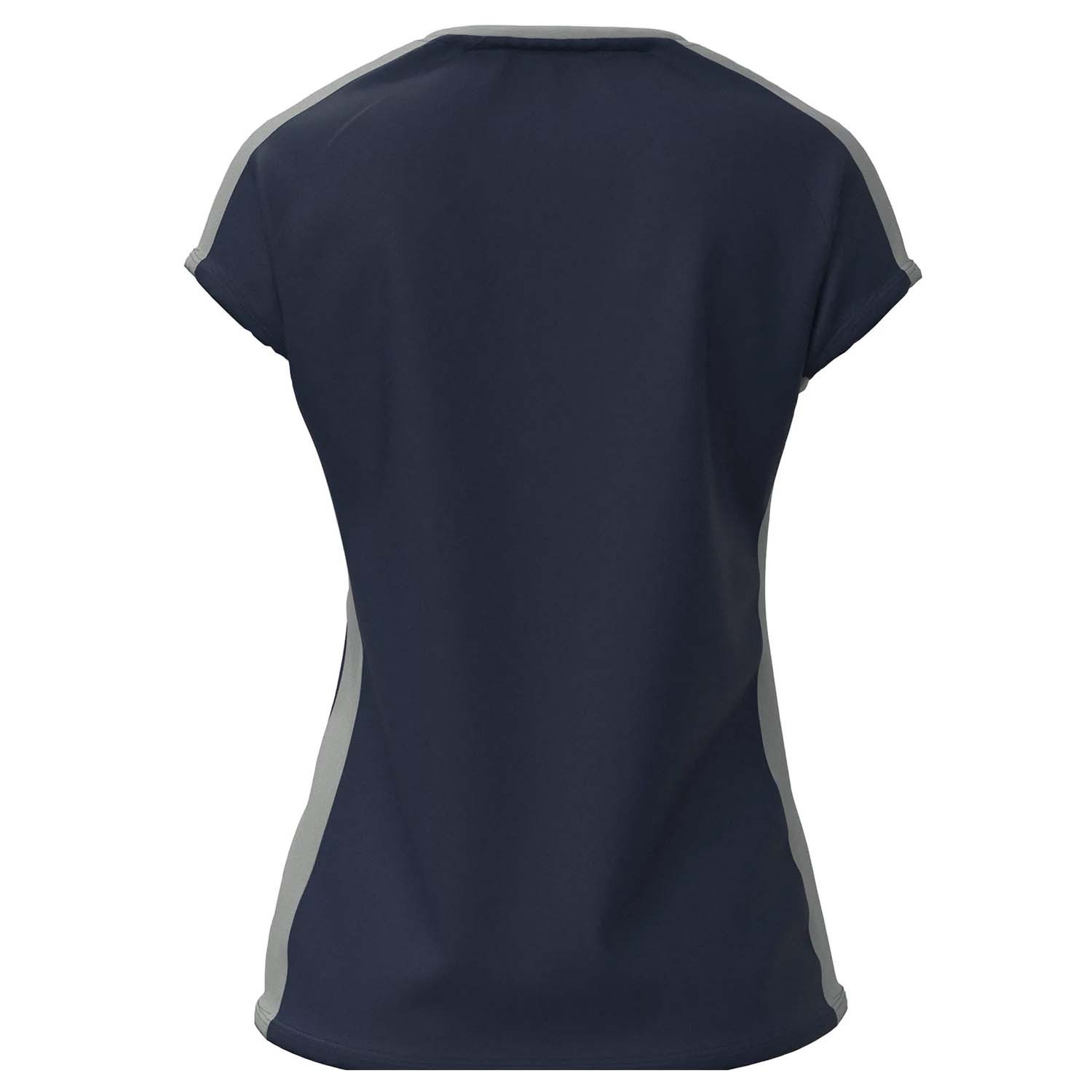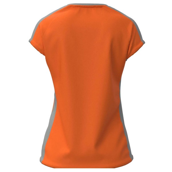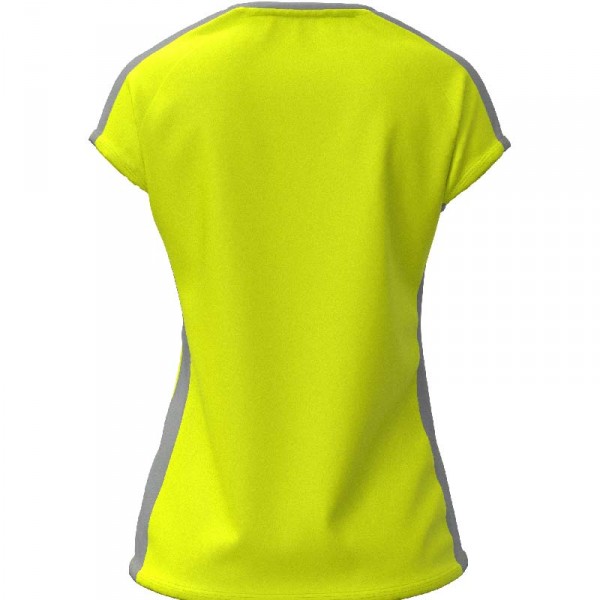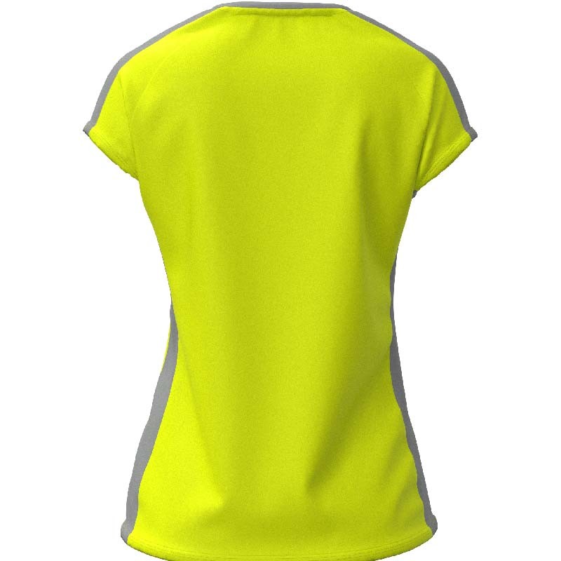 Tee shirt de sport pour femme avec une coupe cintrée à la taille. Son col à mi-chemin entre le col rond et le col V offre un design original, sublimé par la bande grise contrastante spécifique à ce modèle. Optez pour un look sobre mais unique.